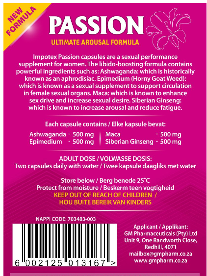 PASSION CAPSULES consist of hard gelatin capsules, size 0, with a grey coloured cap and body, containing fawn coloured powdery contents. PRESENTATION: