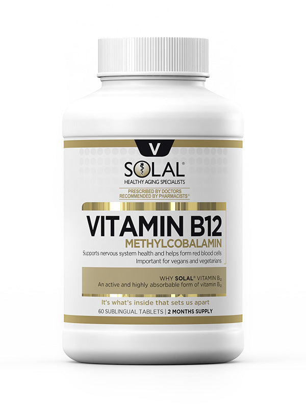 Vitamin B12 is a water-soluble vitamin used to support healthy nervous system function, for the reduction of tiredness and fatigue and improved energy. Vitamin B12 also helps to metabolise carbohydrates, fats and proteins and contributes to normal energy-yielding metabolism. It is particularly important for vegans and vegetarians, whose diets are often deficient in vitamin B12. SOLAL® uses methylcobalamin, the active and effective form.